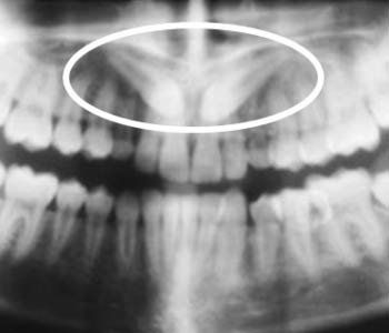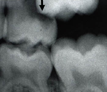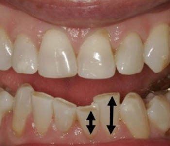 In the back of the mouth, one or more of the top teeth is stuck inside the bottom teeth.
