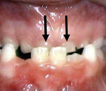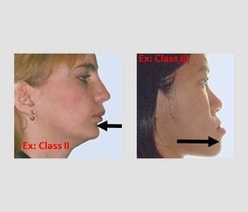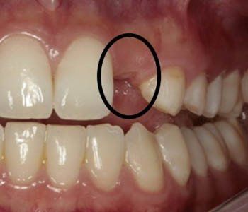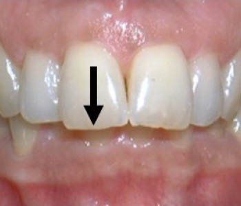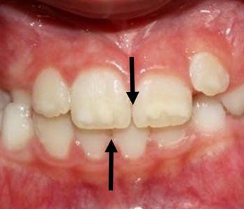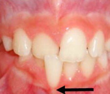 In the front of the mouth, one or more of the top teeth is stuck behind the bottom teeth.